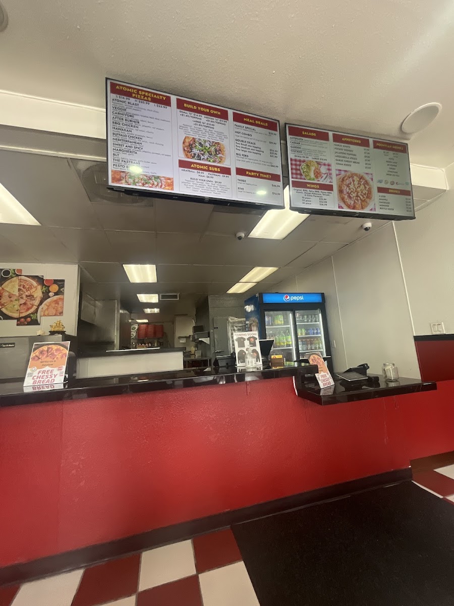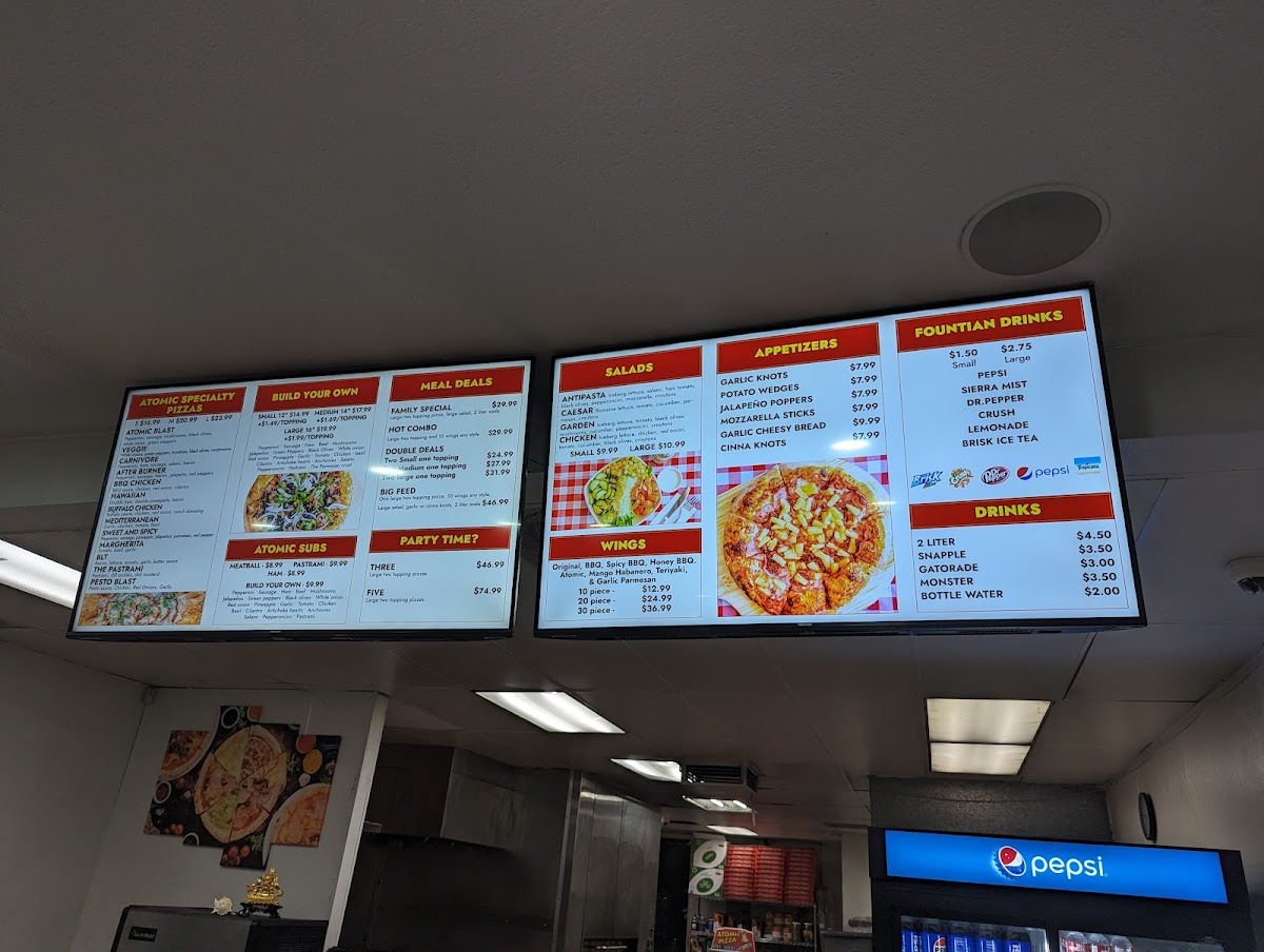 Atomic Pizza offers a variety of delicious options for every craving. For pizza lovers, their Build Your Own Pizza allows for ultimate customization, or you can try one of their signature pizzas like the Atomic Blast or The Pesto Blast Veggie, both full of bold flavors. If you're a meat lover, the Carnivore pizza is a must-try. The restaurant also offers great value with deals like the Family Special and the Hot Combo under their Atomic Meal Deals. For larger groups, there are Double Deals, such as the Two Small One-Topping or the Two Large One-Topping pizzas. For even bigger parties, their Party Time options, including Three Large Two-Topping and Five Large Two-Topping pizzas, are perfect for sharing, with the option to add a Large One-Topping Pizza to any meal deal for just $12.99. If you prefer subs, try their Meatball Sandwich or Pastrami Sandwich, or even create your own Build Your Own Sandwich. The fresh and tasty Antipasto and Caesar salads, as well as the Chicken Garden salad, make for great side options. Don't forget to add some tasty Garlic Knots or Cinna Knots, and of course, the wings are a perfect complement to any meal. To drink, enjoy a refreshing Snapple in various flavors or a Monster energy drink. Atomic Pizza combines great flavors with unbeatable deals, ensuring a satisfying meal every time.